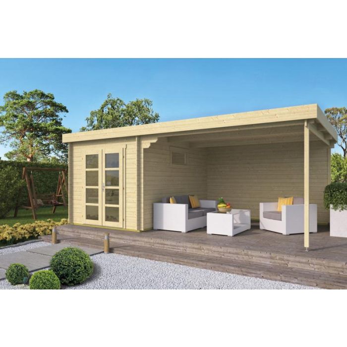 Blokhut - Tuinhuis Diederick Met Overkapping. Houtsoort Onbehandeld Vuren. Houtdikte 28mm. Afmeting 275 + 350 x 375cm. Nokhoogte 234cm. Exclusief 1 Te Openen Raam Met Enkel Glas. Exclusief Dakleer. De Levertijd Is 1 Tot 3 Weken.