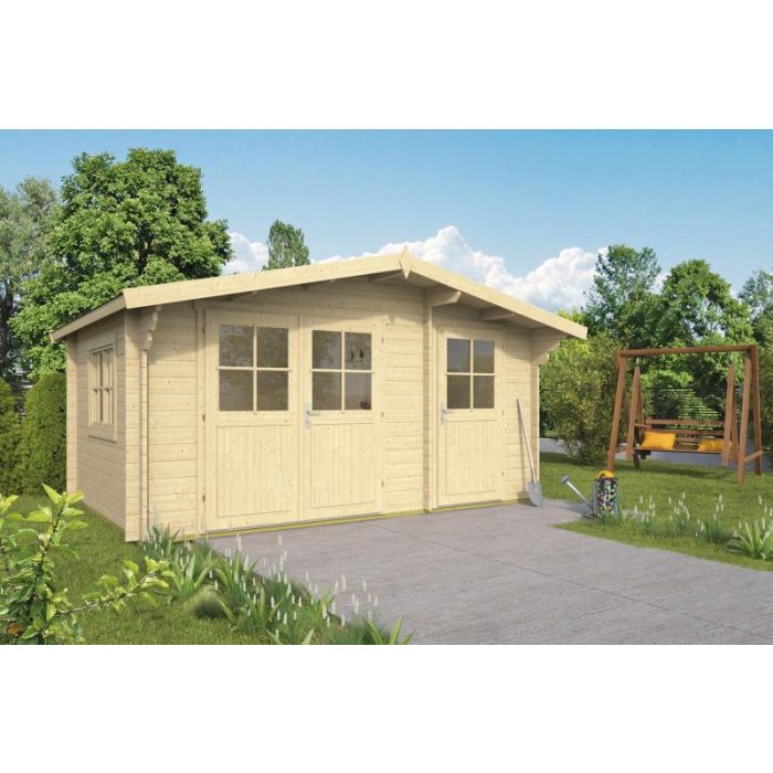 Blokhut - Tuinhuis Fraga 450 x 300cm. Onbehandeld Vuren Hout. Houtdikte 34mm. Nokhoogte 250cm