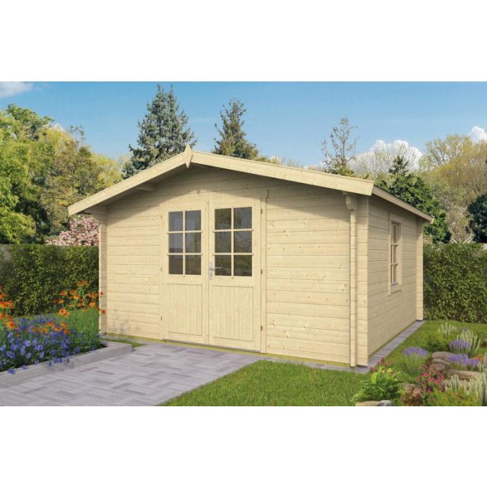Blokhut - Tuinhuis Gunda. Onbehandel Vuren Hout. Afmetingen 400 x 400 + 40cm. Nokhoogte 236cm. Iclusief 1 Te Openen Raam Van Dubbel Glas. Exclusief Dakshingles. Levertijd Is 1 Tot 3 Weken.Voor een complete indicatie kunt u altijd een aanvraag doen via ons mailadres.