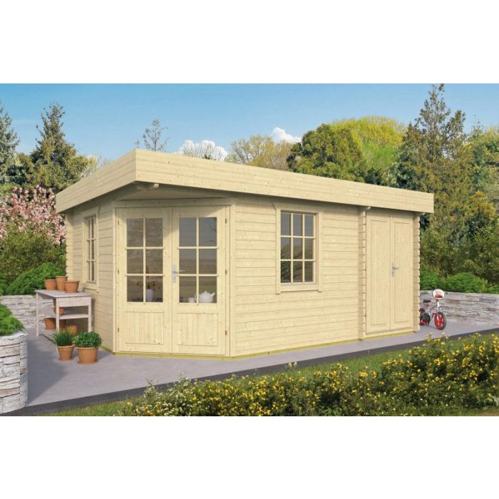 Blokhut - Tuinhuis Helga. Houtsoort Onbehandeld Vuren. Houtdikte 44mm. Afmeting 350 + 150x350cm. Nokhoogte 222cm. Exclusief 2 Te Openen Ramen Met Dubbel Glas. Exclusief Dakshingles. Levertijd Is 1 Tot 3 Weken.Voor een complete indicatie kunt u altijd een aanvraag doen via ons mailadres.