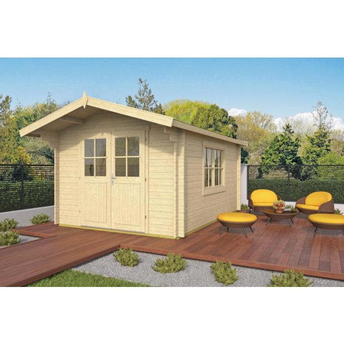 Blokhut - Tuinhuis Pamplona 300 x 400cm. Onbehandeld Vuren Hout. Houtdikte 34mm. Nokhoogte 236cm. Inclusief Enkel Glas. Exclusief Dakshingles. Levertijd Is 1 Tot 3 Weken.Voor een complete indicatie kunt u altijd een aanvraag doen via ons mailadres.
