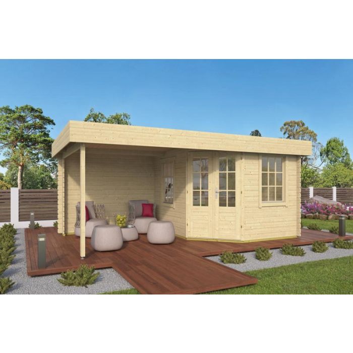 Blokhut - Tuinhuis Stig Met Overkapping. Houtsoort Onbehandeld Vuren. Houtdikte 28mm. Afmeting 250 + 250 x 300cm. Nokhoogte 224cm. Exclusief 2 Te Openen Ramen Met Enkel Glas. Exclusief Dakleer. De Levertijd Is 1 Tot 3 Weken. Voor een complete indicatie kunt u altijd een aanvraag doen via ons mailadres.