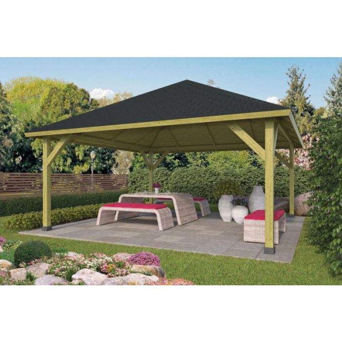 Afmeting 560 x 560cm. Nokhoogte 375cm. Doorloophoogte 203cm. Inbegrepen: bevestigingsmaterialen.