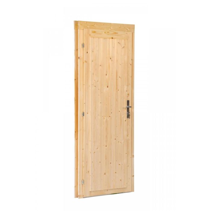 Deze enkele deur is uitgevoerd in massief vurenhout en wordt onbehandeld geleverd. Hierdoor kun je de deur volledig naar wens afwerken met verf, lak of beits, passend bij jouw tuinhuis, schuur of bijgebouw.