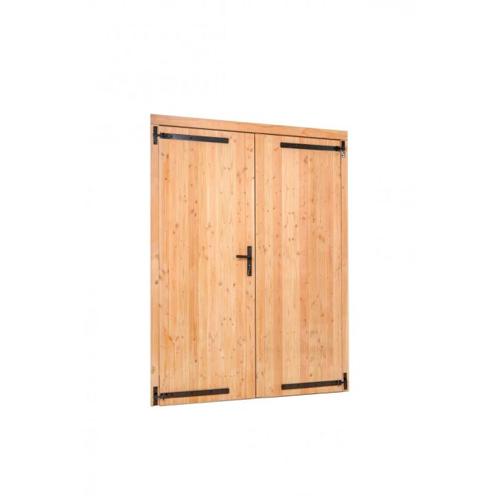 Douglas Dubbele Klampdeur. Afmeting 1850 x 2050MM. Binnenwerksemaat 180 x 201,5CM. Buitenwerksemaat 185 x 205CM. Deurtype: Dubbele Deur. Draairichting Deur: Links Scharnierend. Houtsoort: Douglas. Materialen Hout en RVS. Inbegrepen: Inbouwslotset SKG** Zwart.