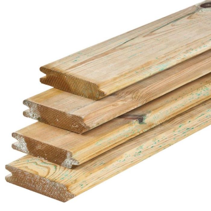 Impregnated pine. Double tongue-and-groove. Smoothly planed. Working width 12.8 cm.