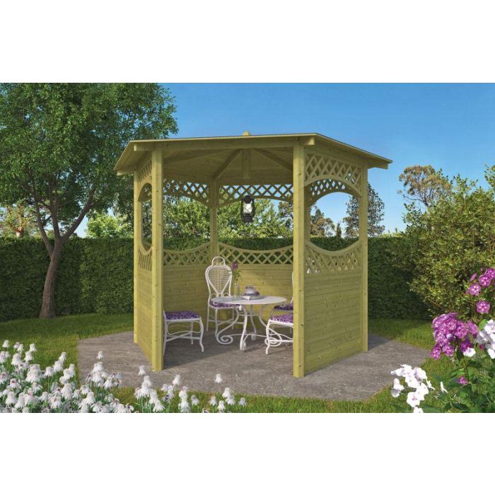 Afmeting 234 x 290cm. Nokhoogte 270cm. Doorloophoogte 210cm. Inbegrepen: bevestigingsmaterialen, trellis en zijpanelen.