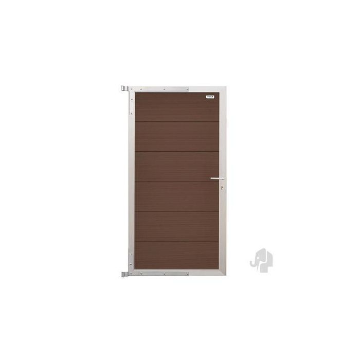 Elephant Houtcomposiet Forte Tuindeur. Houtcomposiet Bruine Lamellen Met Geanodiseerd Aluminium Kader. Afmeting 90 x 180 CM. Inclusief Hengen. Met Duimen, Deurstop Profiel, Cilinderslot En Deurkrukken.