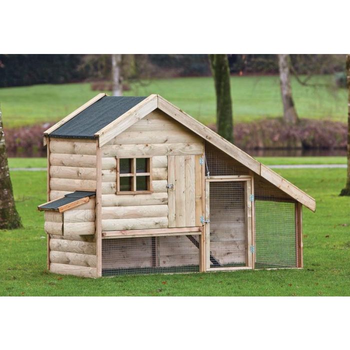 Kippenverblijf Ancona. Afmeting 250 x 100CM. Nokhoogte: 170CM. Houtsoort: Geimpregneerd, Geschaafd Vuren. Inclusief: Binnenhok Met Deurtje, Plexiglas Raampje, Legnest, Zitstok En Bevestigingsmaterialen.