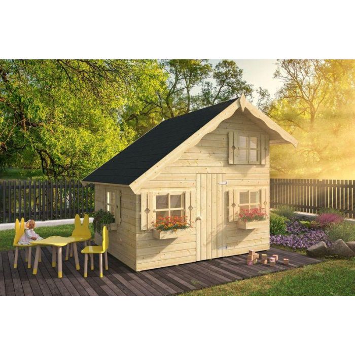 Speelhuisje Lola. Afmeting 220 x 180CM. Nokhoogte 230CM. Dikte Wand 16MM. Houtsoort Onbehandeld, Geschaafd Vuren. Inclusief Dakleer, Houten Vloer En Bevestigingsmaterialen. Het Speelhuisje Wordt Met Voorgemonteerde Wanden Geleverd.