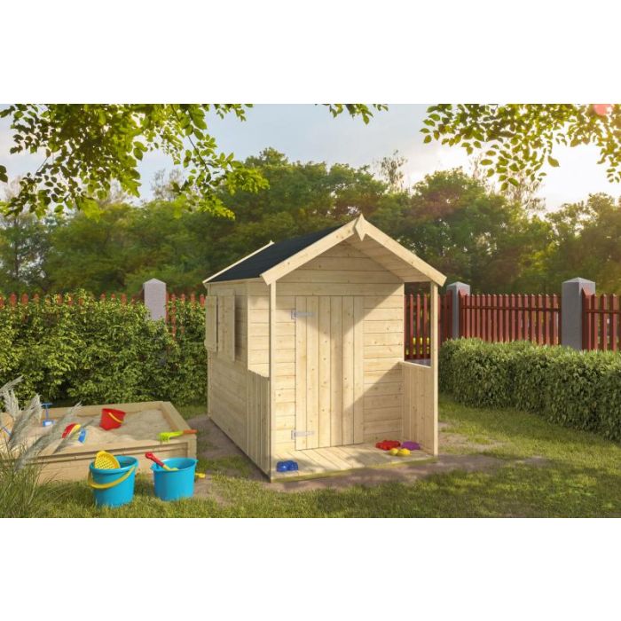 Speelhuisje Pinokkio. Afmeting 115 x 180CM. Nokhoogte 160 cm. Afmeting veranda 40CM. Dikte Wand 16MM. Houtsoort Onbehandeld, Geschaafd Vuren. Inclusief Dakleer, Houten vloer En Bevestigingsmaterialen. Het Speelhuisje Wordt Met Voorgemonteerde Wanden Geleverd.