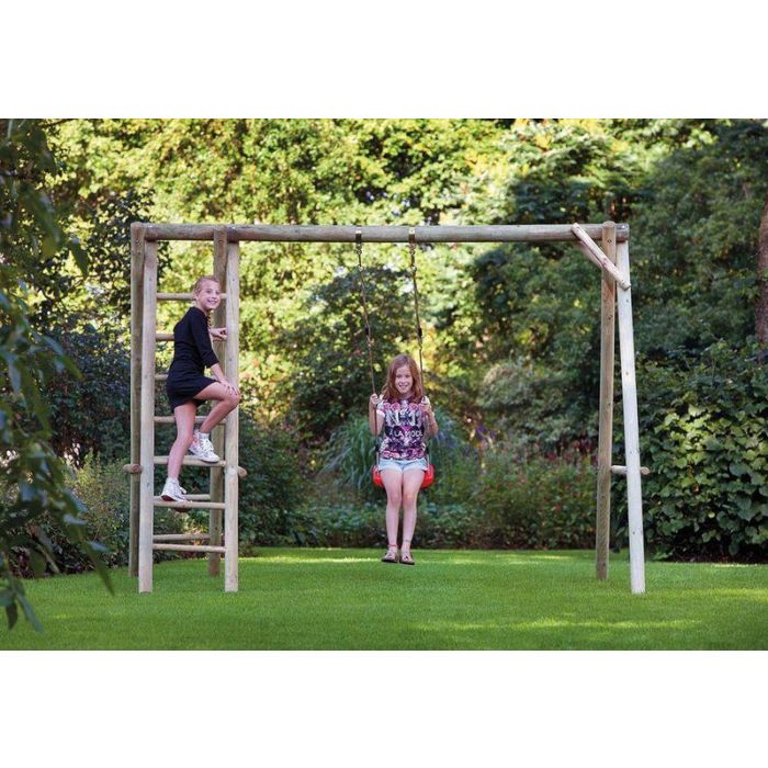 Speeltoestel Econoom Afmeting 300 x 230 x 225CM. Diameter Schommelbalk 10CM. Houtsoort Geimpregneerd, Geschaafd Grenen. Inclusief 4 Grondankers En Bevestigingsmaterialen. Exclusief Speelgarnituur.